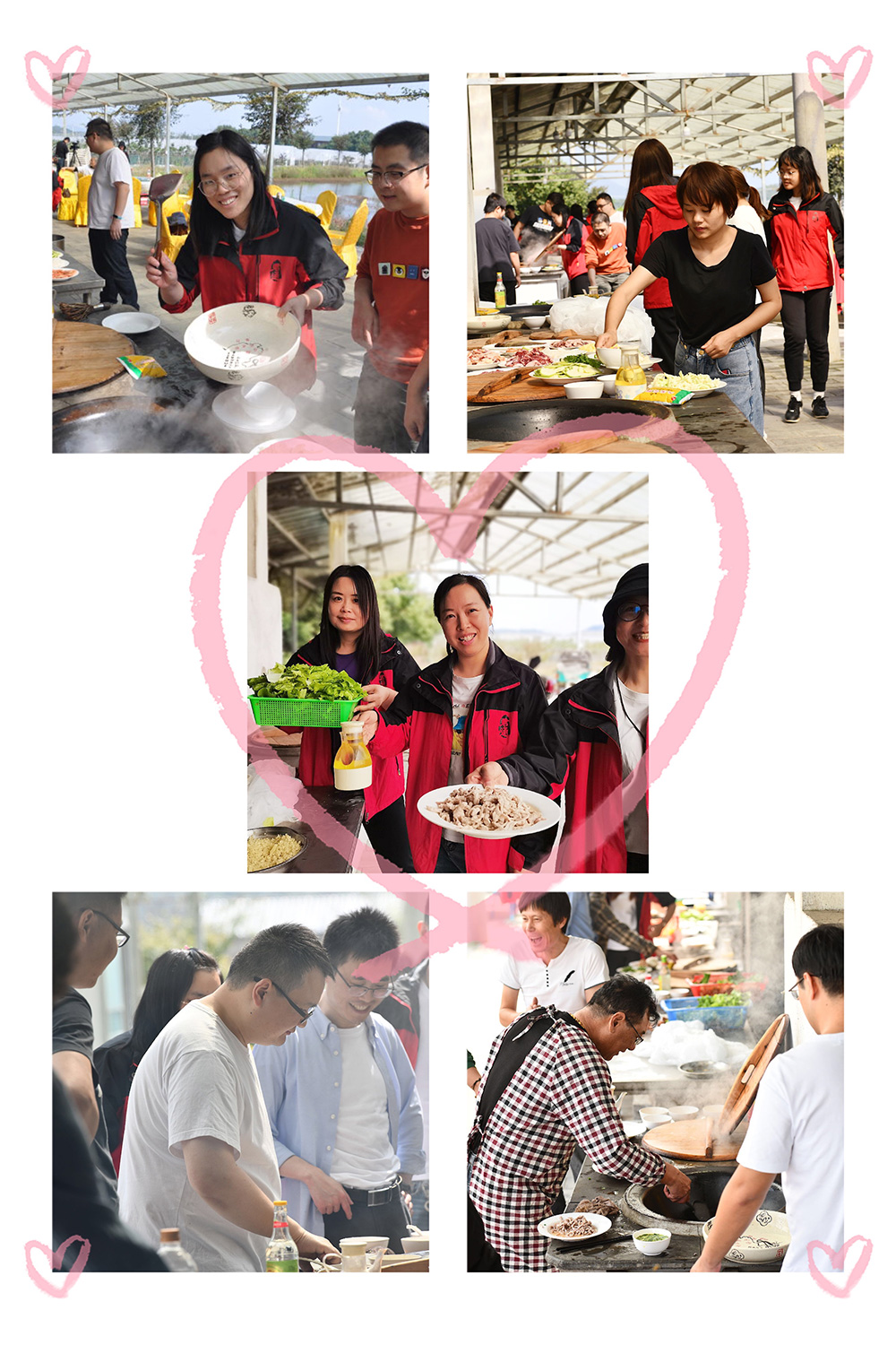 旁边,靓的风景当属我们客服商务Team,有3位帅哥的加盟、客服姑娘们忙得不亦乐乎,烧火、洗菜、协助主厨小威有节奏的进行着烹烧蒸煮俱清香, 奏响美食的音符,特别感谢市场部大哥哥大姐姐们、他们不仅工作中热情指导帮助新人成长,在我们提出帮我们一起烧几道菜时爽快答应,在他们的鼎力相助下很快我们客服也准备开饭啦:
