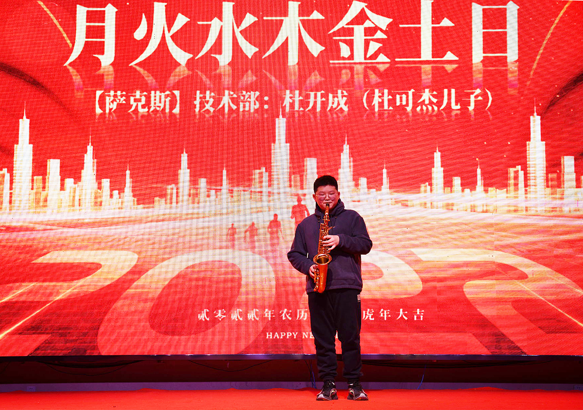 来考考大家,刚才我们舞台上出现过哪些乐器了?我们刚才听过了笛子、二胡、吉他,接下来让我们听听萨克斯的音色,杜公子开开为我们带来精彩的《月火水木金土日》: