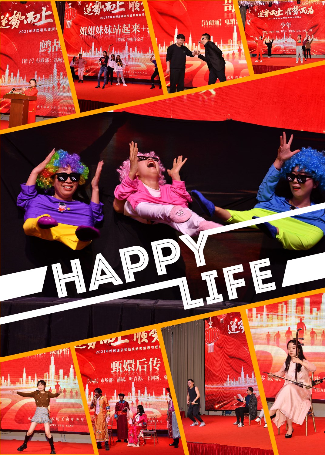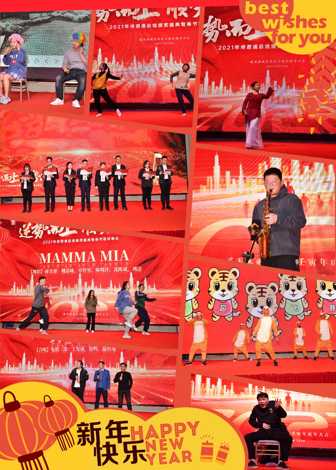 接下来是我们的晚会表演,我们的节目丰富多彩,其中舞蹈多种多样,有市场部的《少年》、技术部的《黑夜里的一束光》《五只猛虎爱跳舞》、客服部的《姐姐妹妹站起来+护花使者》《小人舞》、商务部的《MAMMA MIA》等,从舞蹈的难度、动作等,可以看出花费了时间与心血的,俗话说台上三分钟,台下十年功,真的是由此可见了;我们的小品也是看了令人捧腹大笑,有市场部的《甄嬛后传》《试镜》、商务部的《十年之后》、电销部的《并非讽刺医生》等,道具充足,演技在线,很有演员的天赋;公司的党支部朗诵的《请党放心 强国有我》,听了后心潮澎湃,久久不能平静;还有小朋友的表演,笛子《鹧鸪飞》舞蹈《dreams come true》、吉他《送别+友谊地久天长》、萨克斯《月火水木金土日》、架子鼓《踏山河+像风一样自由》等,小朋友们多才多艺的表演给我们的晚会增加了青春活力、欢声笑语,我们还有手语、二胡、走秀等节目,晚会中我们的欢声笑语不断,沉浸其中。
